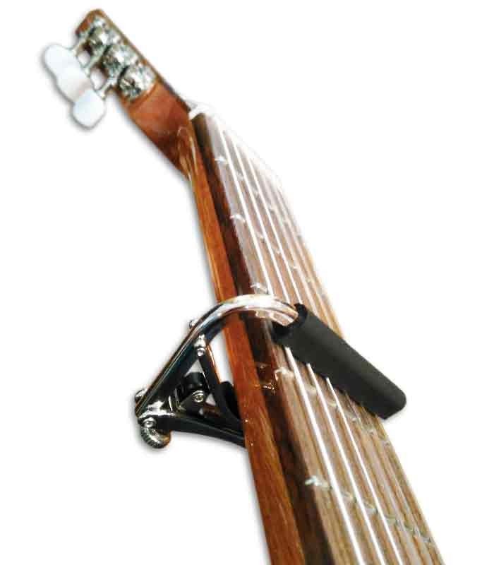 A special rubber band works exactly like a fingertip and does not bend the strings over the frets, so no readjustment is necessary.