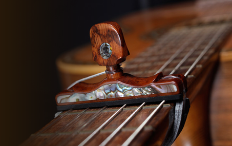 The capo is an accessory used to replace the capo made on the frets with the index finger, thus allowing the player to use his finger freely on the guitar. The capo is used to change the key and tone of the strings played in the air on a guitar without the need to tune it differently.