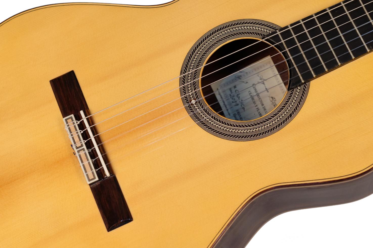 This professional classical guitar made by luthier Ayman Bitar Serrano has everything a professional guitarist needs in terms of sound, performance and wood quality. The sound of this guitar is rich, full of details and nuances, with a sound with great body and volume. This guitar has a select German Spruce-Pinewood top with over 50 years of seasoning and Indian Palo Santo body and cedar neck with ebony fingerboard. The deluxe headstock gives the guitar a precise and smooth tuning.