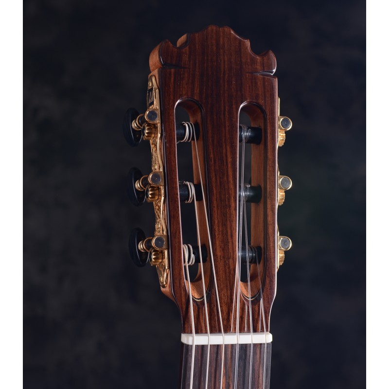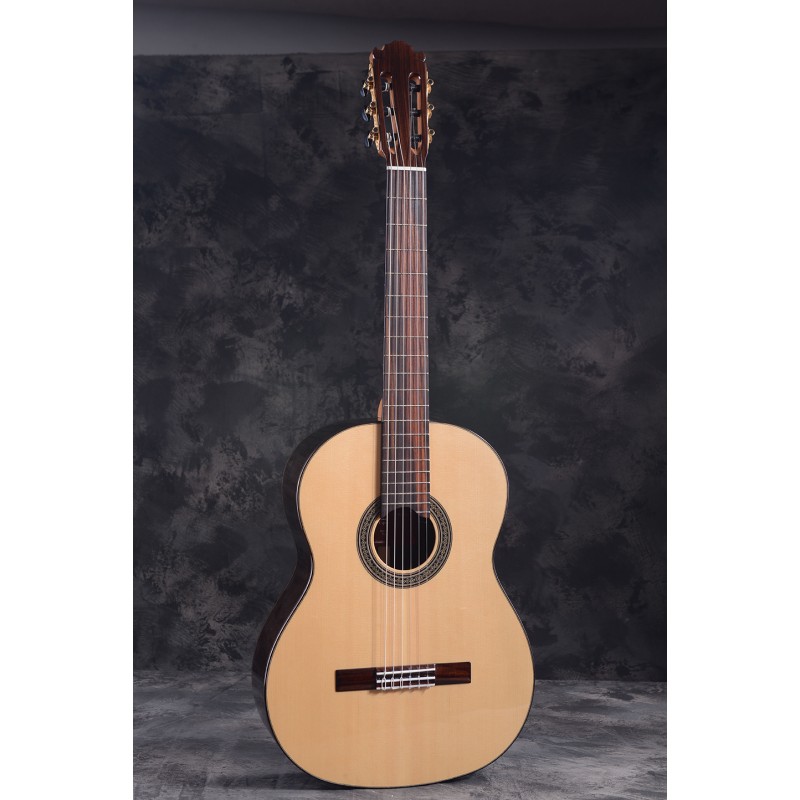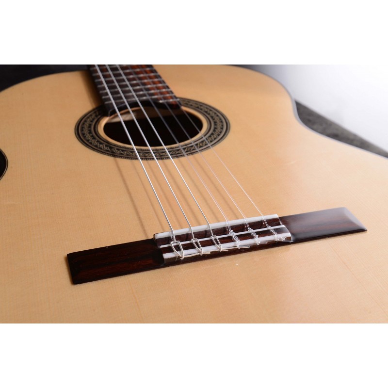 The back and sides are also made of selected rosewood, a precious rosewood and a very nice soundhole making it have a serious and formidable presence.