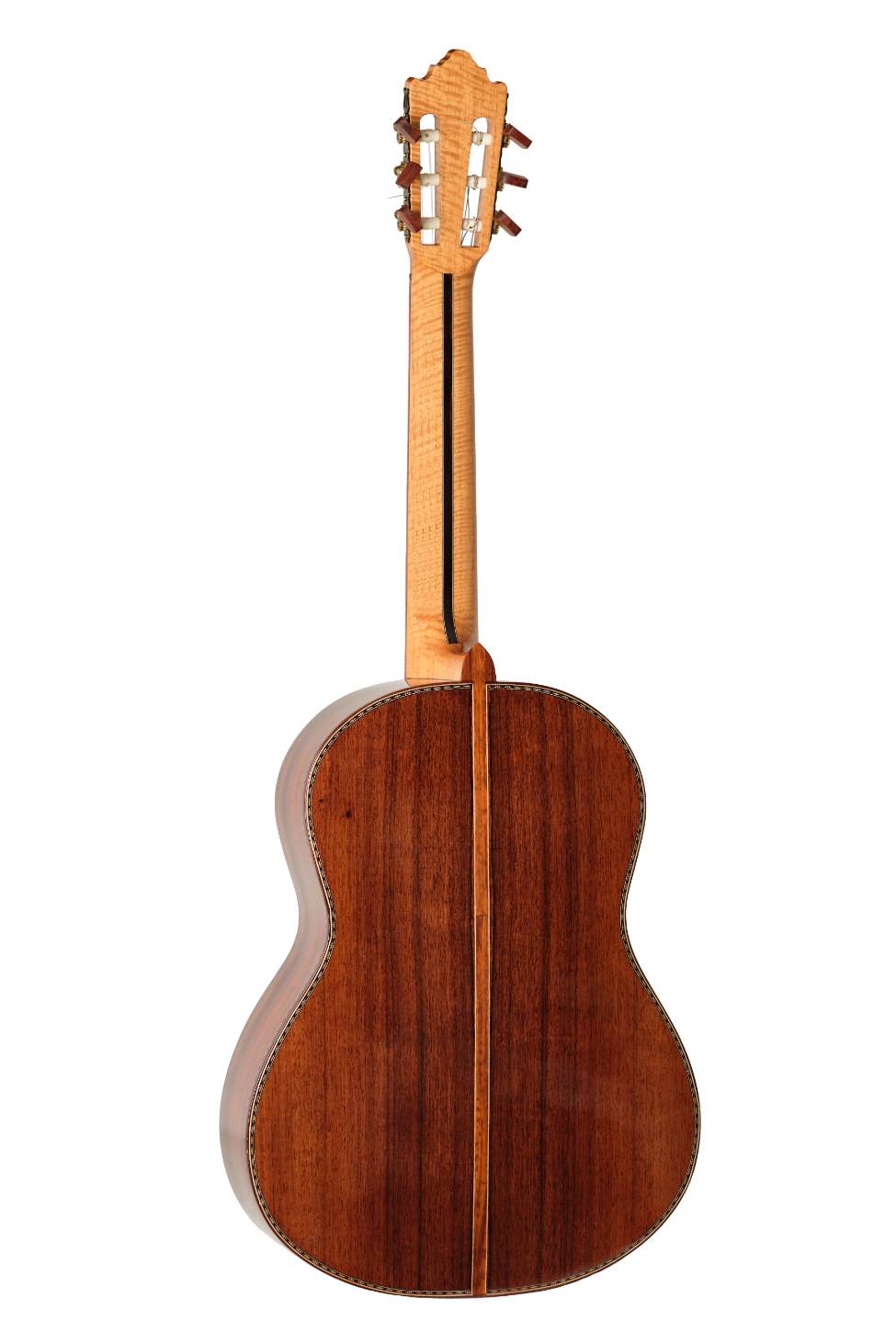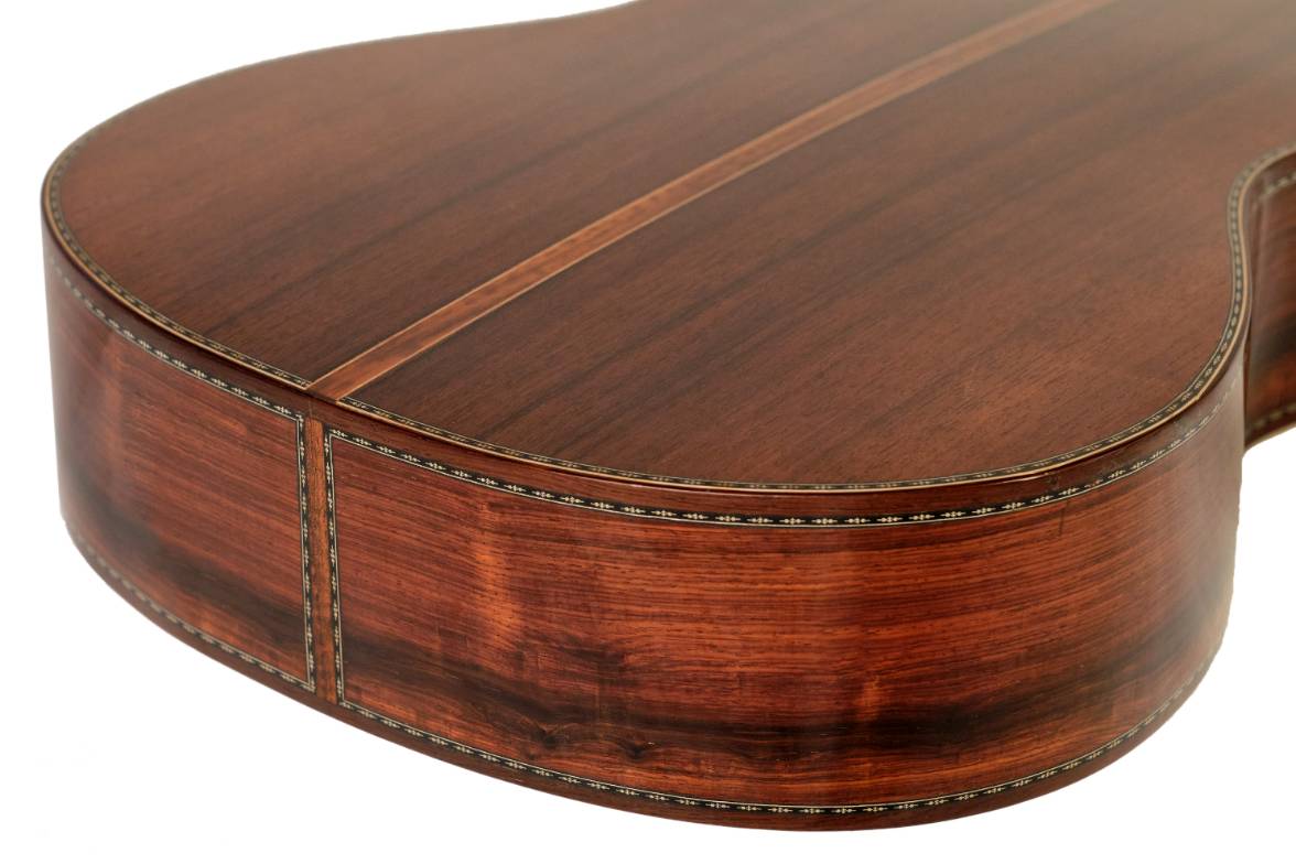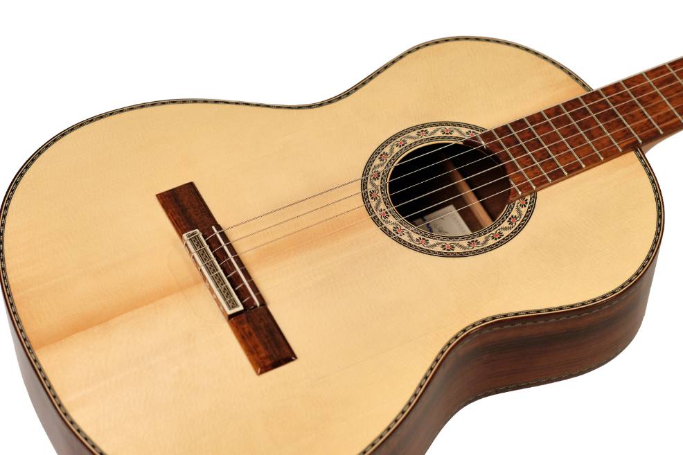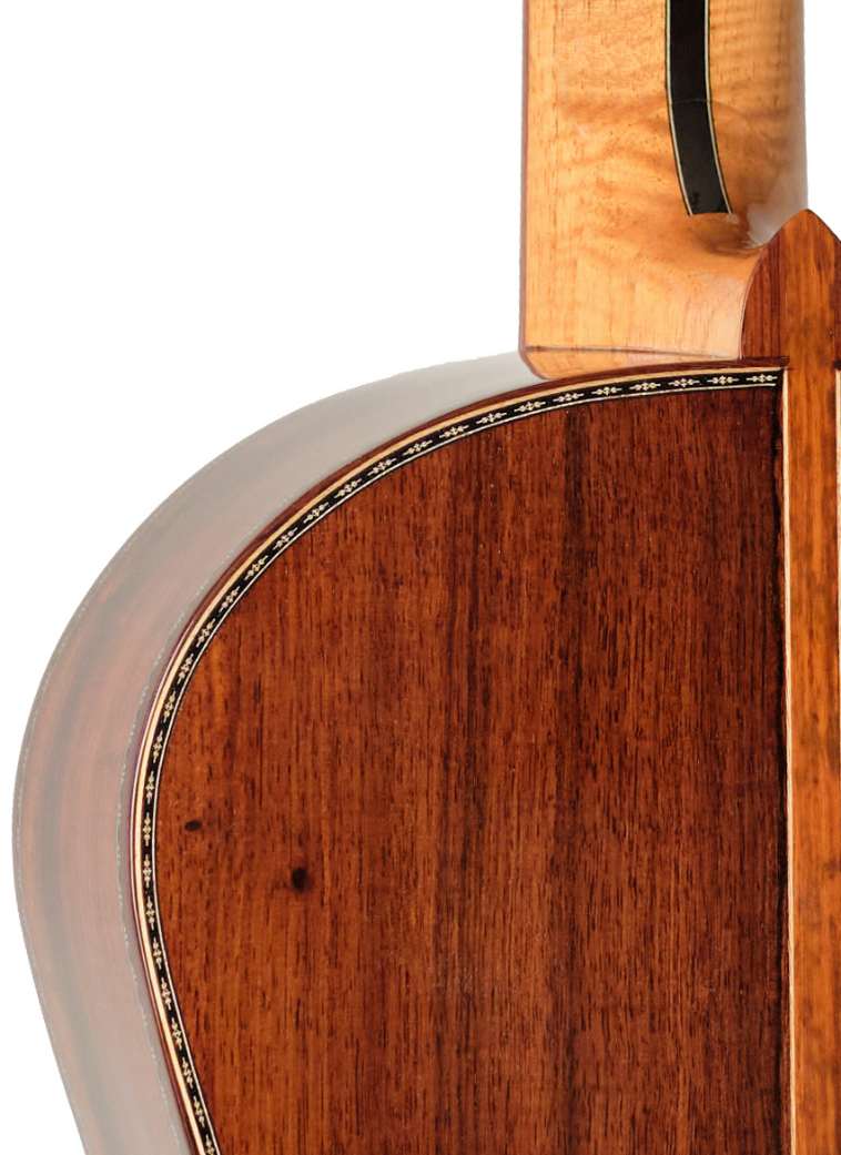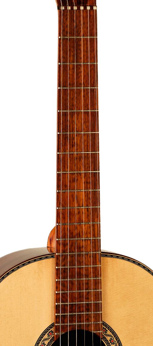 This Palo Santo de Amazonas flamenco guitar has a German Spruce-Pine top, Palo Santo de Amazonas sides and back with more than 25 years of seasoning and a curly Cedar neck reinforced with an Ebony core. Snakewood fingerboard and bridge.