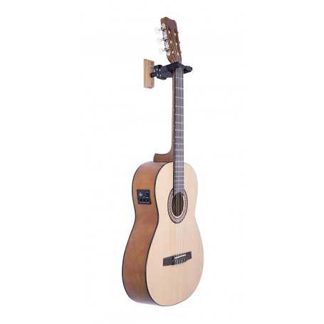 El nuevo soporte Hercules GSP-38WB PLUS con base de madera para atornillar a la pared con mecanismo de autogirado permite poder colgar guitarras y bajos con distintos tipos de pala. Apto para guitarra clásica y flamenca.